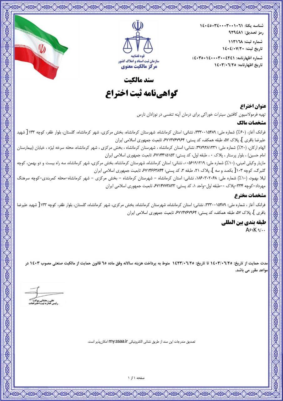 در ادامه مسیر درخشان فعالیت های پژوهشی و نوآورانه مرکز تحقیقات دارورسانی نانو، اختراعی با عنوان "تهیه فرمولاسیون کافئین سیترات خوراکی برای درمان آپنه تنفسی در نوزادان نارس" به شماره ثبت 113168توسط سرکار خانم دکتر فرانک آغاز از اعضای محترم هیات علمی این مرکز به ثبت رسید.
