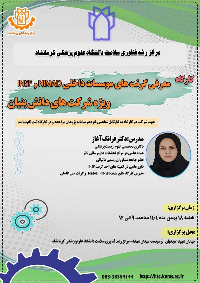 کارگاه معرفی گرنت های موسسات NIMAD و INSF ویژه شرکت های دانش بنیان با ارائه سرکار خانم دکتر فرانک آغاز عضو محترم هیات علمی مرکز تحقیقات دارورسانی نانو در مرکز رشد فناوری سلامت دانشگاه علوم پرشکی کرمانشاه شنبه 18 بهمن ماه 1404 از ساعت 9 الی 12 برگزار می گردد.